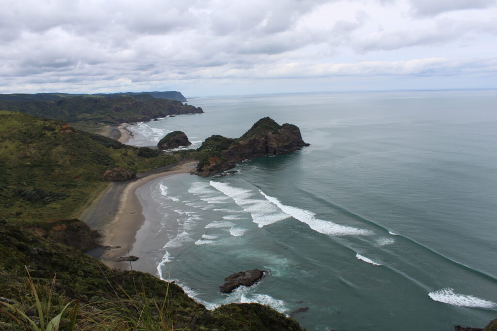 Después de nuestra emocionante experiencia en el lago, decidimos hacer una caminata hacia los acantilados de Bethells para disfrutar de las vistas panorámicas. El sendero ascendente fue desafiante pero gratificante. A medida que subíamos, pudimos apreciar aún más la grandeza y la vastedad de la playa de Bethells. Desde la cima de los acantilados, el horizonte se extendía hasta donde alcanzaba la vista, con el océano ondulante y las olas rompiendo con fuerza en la costa. Nos sentamos en silencio, maravillados por la magnificencia de la naturaleza y agradecidos por poder presenciar ese espectáculo.