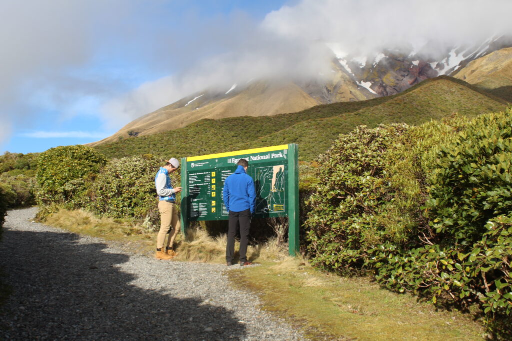 Recibí información en la oficina de que la ruta era viable hasta los 2.300 metros de altitud, ya que la presencia de nieve hacía impracticable seguir sin el equipo adecuado. Me aseguraron que el clima mejoraría a medida que avanzara la mañana. Decidí adquirir un mapa detallado de la zona (Topo50 map Mt Taranaki por 9$) y así emprendí mi camino.